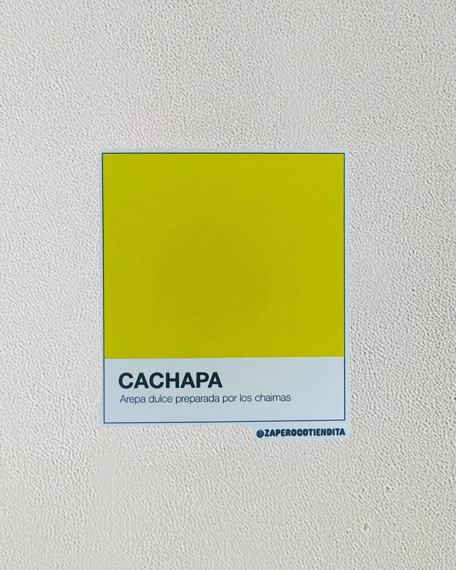 Con estilo tarjeta de color Pantone, identificando el color de la Cachapa. En donde iría el código de color está de donde viene el nombre de la cachapa.